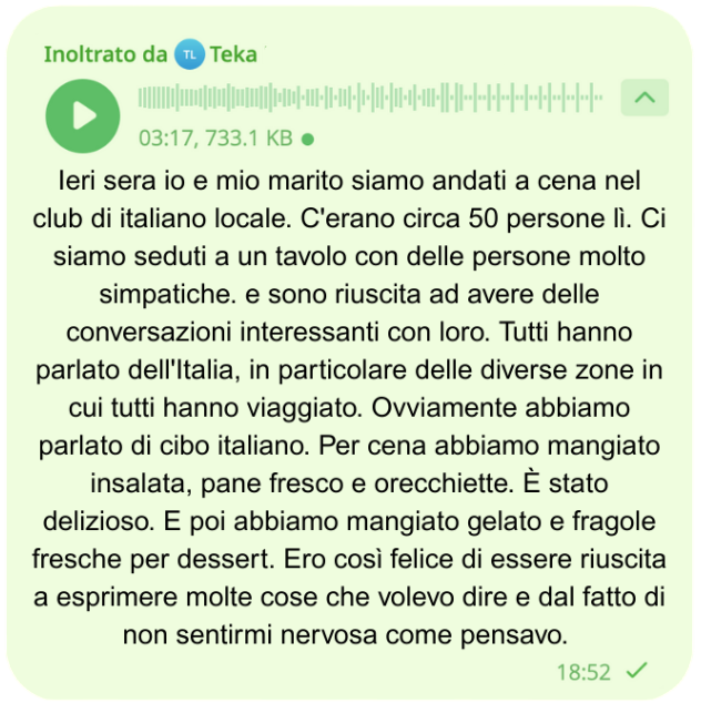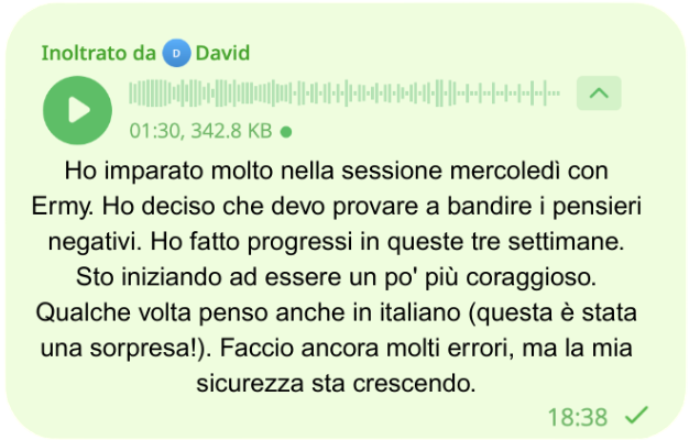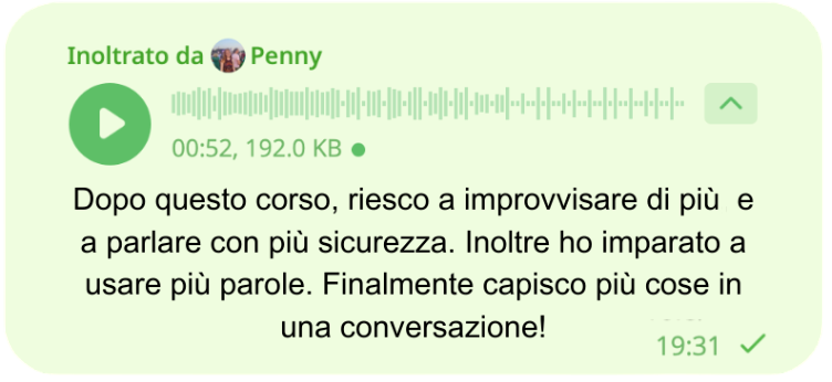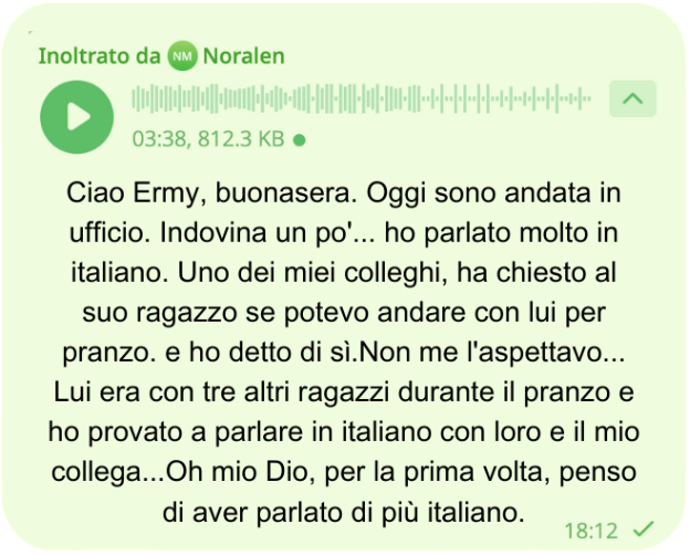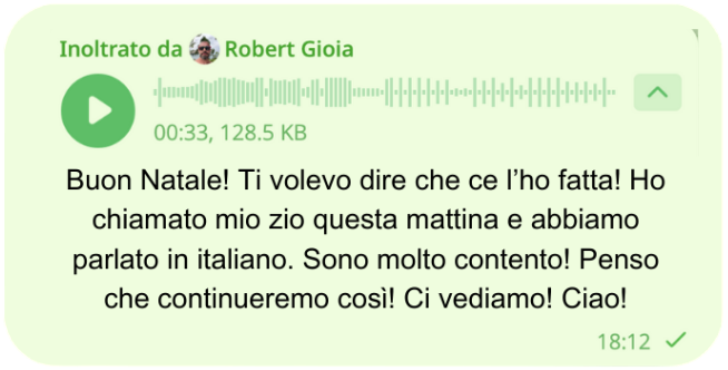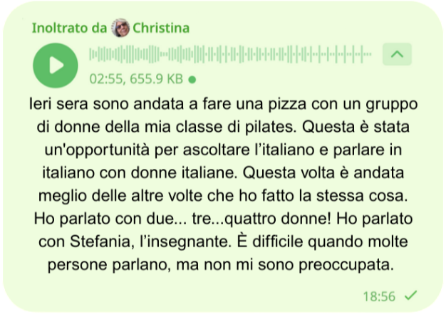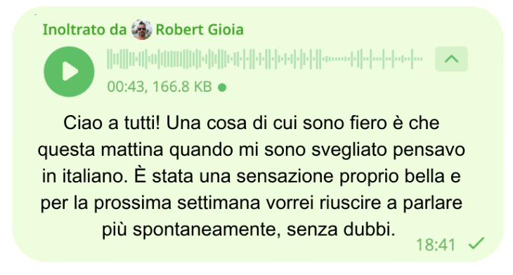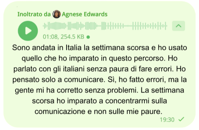 My favorite way to do this is by using the "magical" tool of voice messages (ever sent a voice note? 😉). It allows you to speak and listen to Italian consistently (without arranging a meeting) anytime, anywhere. This is one of the reasons why speaking becomes second nature for my students.